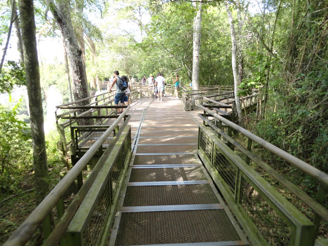 Despúes de llegar a la estación Garganta del Diablo en tren aun falta hacer una caminata de un kilómetro hasta llegar al salto propiamente dicho. Durante este recorrido pasas caminando sobre el agua a traves de las caminerias de acero. En esta parte es donde se puede observar que la parte superior de río Iguazu parece un gran delta o desembocadura. Es una gran extensón cubierta por aguas de pocas profundidad y que poco a poco se van encerrando y acumulandose para luego caer o desfogar por las aberturas que se forman entre las grandes piedras. Es un espectaculo. A lo largo del recorrido se pueden observar muchas aves y grandes peces que se ha habituado a la presencia humana.